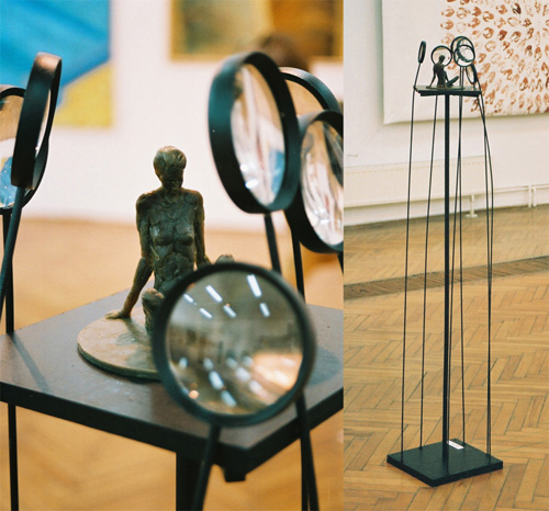 Zuzanna i Starcy II, wosk, szkło powiększające, pręty stalowe, wys. 150 cm, Salon Jesienny 2005, Zielona Góra
