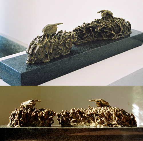 z cyklu Idee TRON, brąz, granit, dł. ok. 65 cm, postaci ok. 10 cm, 2000